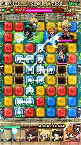"Embark on a Puzzle Monster Quest in Attack on Titan! Join forces with brave heroes to defeat giant orks and save the remaining people from massive monsters. Descend into dungeons filled with dangerous creatures and create chains of identical tiles to help your squad attack. Upgrade your weapons and craft powerful gear to take down mighty opponents. With 17 unique characters, over 1000 monsters to battle, and the ability to play with friends, this Android game offers endless excitement!"