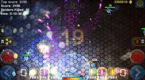 "Spider Revolution: Defend Your Gun Mount Against Oncoming Spider Robots! Fight against the advancing mechanical spiders in this Android game. Take control of a versatile gun mount and purchase various projectiles to freeze, explode, or turn your enemies against each other. Don't forget to use the energy shield to protect yourself during intense battles. With great graphics, good music and sound, and multiple levels, climb the leaderboards and become the ultimate spider-fighting champion!"