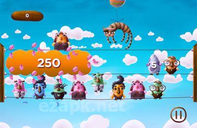 In Fur and Feathers, an unusual interpretation of match 3 styles of games, birds of different colors and types sit on three tense wires. If the wires are not cleared of the birds, one of them will become dinner for the cats flying in a balloon above the wires. To delete the birds from the wires, players must collect at least three birds of the same color or type. To move birds from the bottom wire to the top, players must pull back the wire in the right place and launch the bird. When a group of birds of the same color or type is collected, they can be connected and shifted to the edge of the screen to gain points and free up space. The game features two game modes: Easy for children aged 4 and up, and Hard for children aged 10 and up. Players can also jump, move, and match the birds to gain more points, as well as achieve fever mode for point multiplication. Additionally, there is a Tic-tac Egg that must be matched quickly with any two paired birds, and Sparkles that must be touched quickly to clear the wire. Finally, the game supports multitouch, allowing players to play with both hands or even with friends.